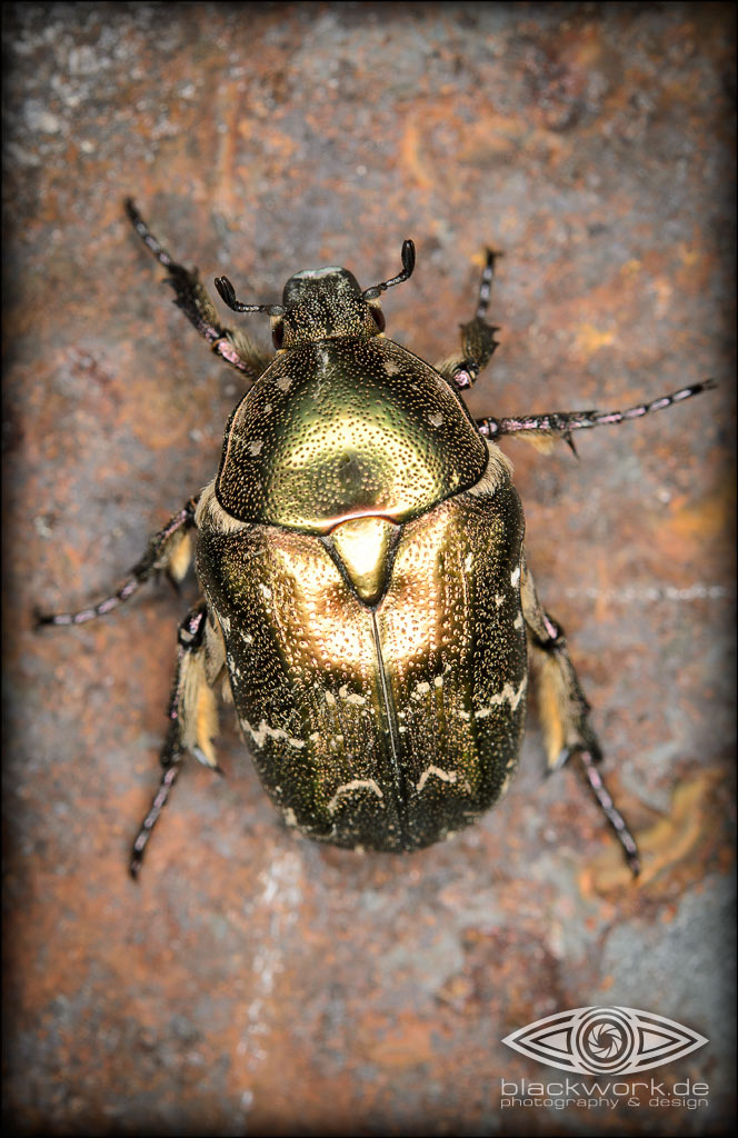 Es ist ein Kupfer Rosenkäfer, fotografiert mit einem 60mm Makro Objektiv mit aufgesetzten Ringblitz. Fotografiert auf einem rostigen Blech.