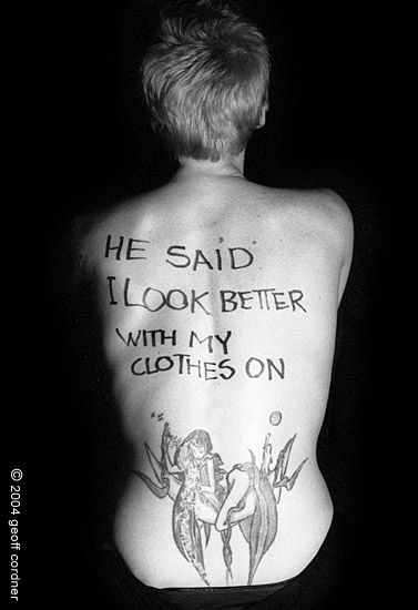 also, ich finde die bilder sehr schick.. auch in verbindung mit den tattoos.. mir gefallen die sprüche sehr die auf den einzelnen personen stehen.. die arts so mit der kritik abnderer umzugehen und das so fotografisch umzusetzten gefäöllt mir doch sehr.. hach ich glaub ich bin heut mal wieder ein wenig sentimental oder so.. darum auch der ganze beitrag hier ;) aber vielleicht gibtz hier ja so ein oder zwei, denen so etwas auch gefällt ;)