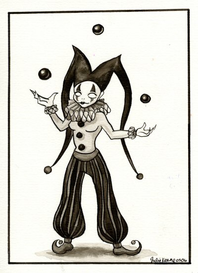 Seit einiger Zeit bin ich am Herumüberlegen für meinen nächsten Tattoowunsch. Einen Clown oder Harlekin, der mit 3 Keulen jongliert.