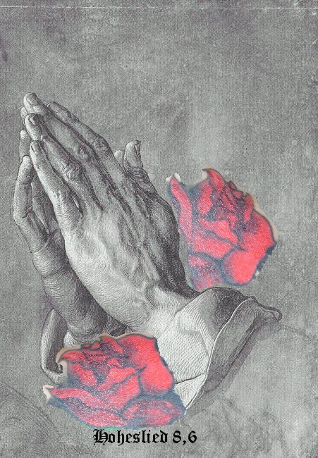 Hmm... jetzt bringst Du mich ein wenig aus dem Konzept. Ich find die Dürer-Hände an sich auch schon klasse, aber irgendwie scheinen mir die Hände allein doch etwas zu wenig. Hatte auch schon überlegt, anstatt der Rosen lieber Lilien zu nehmen...
