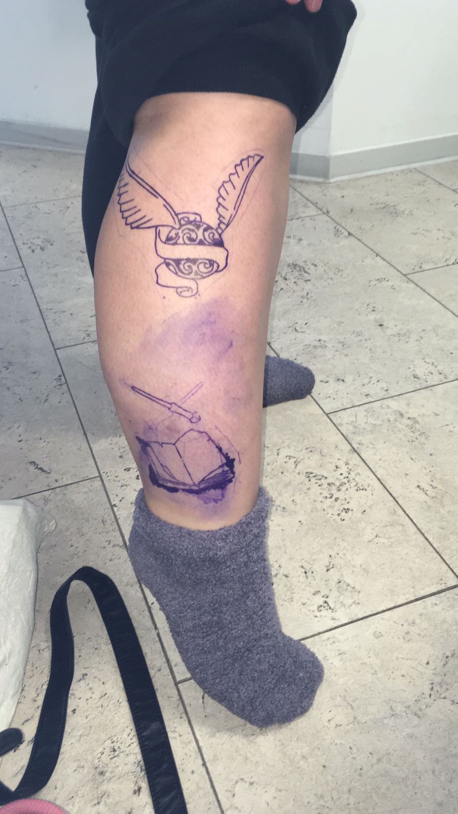 Am 10.02. dieses Jahr habe ich mein lang ersehntes 2. Tattoo gestochen bekommen. Dabei ist leider der SuperGau passiert, mein Tätowierer hat ein Wort falsch geschrieben. Es fällt mir gerade etwas schwer, das zu formulieren, denn ich möchte keinesfalls, dass er in einem negativen Licht dasteht. Noch dazu sehe ich die "Schuld", wenn man von sowas überhaupt sprechen kann, eher bei mir, als bei ihm, denn ich habe das ja schließlich abgenickt. Man muss aber dazu sagen, dass das Stencil für die Schrift erst nach 1 Stunde stechen aufgebracht wurde und ich wirklich total neben der Spur war. Es war einfach eine wahnsinnig angespannte Situation, ich hatte wirklich üble Schmerzen und war nervlich nicht gut aufgestellt. Er brachte also das Stencil auf und bat mich es im Spiegel anzusehen, ob alles passt. Habe ich auch gemacht, allerdings ist der Schriftzug an der Außenseite des rechten Beines, also sah ich die ganze Chose von oben, spiegelverkehrt und natürlich inmitten der Farbe die bereits auf dem Bein war.