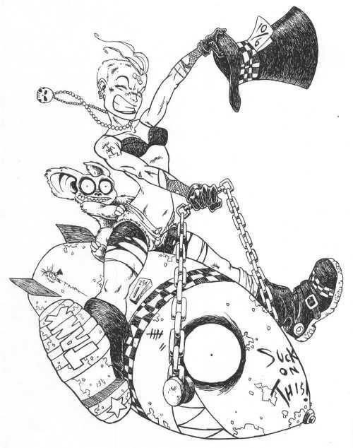 habe zwar gestern beim durchstöbern von Photbucket (Suchebgriff "Tank Girl") eine colorierte Fanart gefunden, aber das war das einzige Farbige (da war die Bombe rot). Hätte versucht es nochmal zu finden, aber leider wirft mir Photobucket das Bild nicht mehr aus