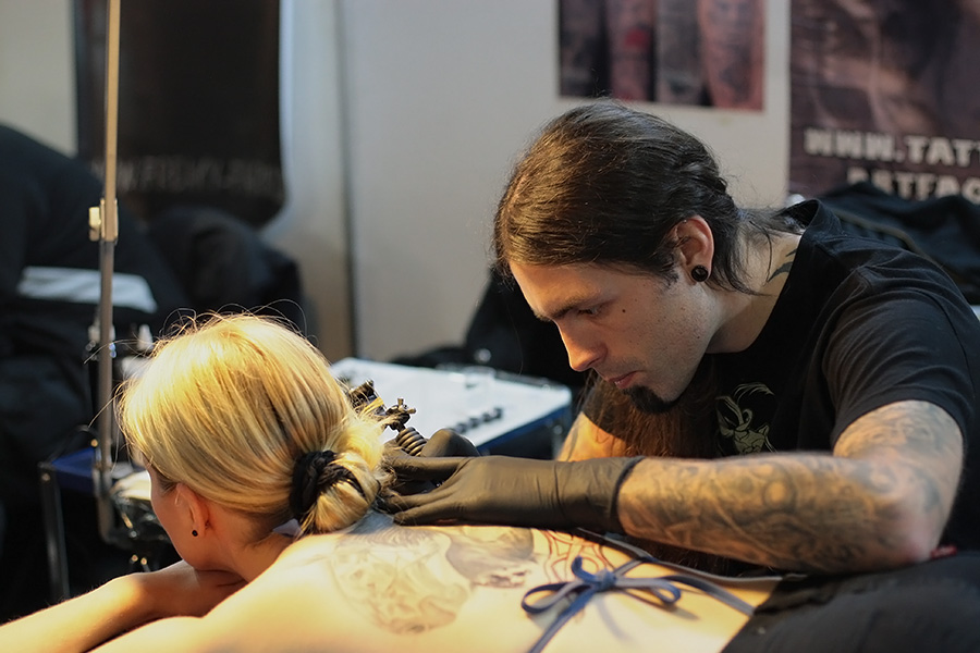 Timmy kommt also rein und geht grade auf den Stand neben dem von kYnst zu wo ich grade gestochen wurde. Dort arbeitet eine Spanierin grade am Oberarm einer Kundin. Das war Timmy aber egal, was Timmy interessant fand war der Freund der Kundin, der hatte nämlich ein "Treibell".