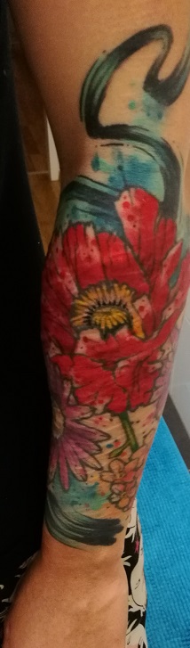 Die Mohnblume innen ist wirklich ein Punkt der mich sehr stört. Allerdings auch weil diese Stelle so zentral am Arm ist. Eventuell könnte man aber rechts, wo das gelbe runtergeht und nicht so stimmig wirkt, das seitliche Blatt erweitern und zumindestens den äußeren gelben Teil schwarz machen. So wollte ich es eigentlich und so ist es bei der echten Mohnblume.