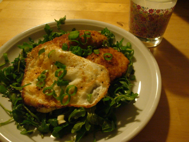 vegetarische schnitzel dinger tomate-mozzarella, ein verunglücktes spiegelei, rucola, frühlingszwiebeln.. .dazu buttermilch.